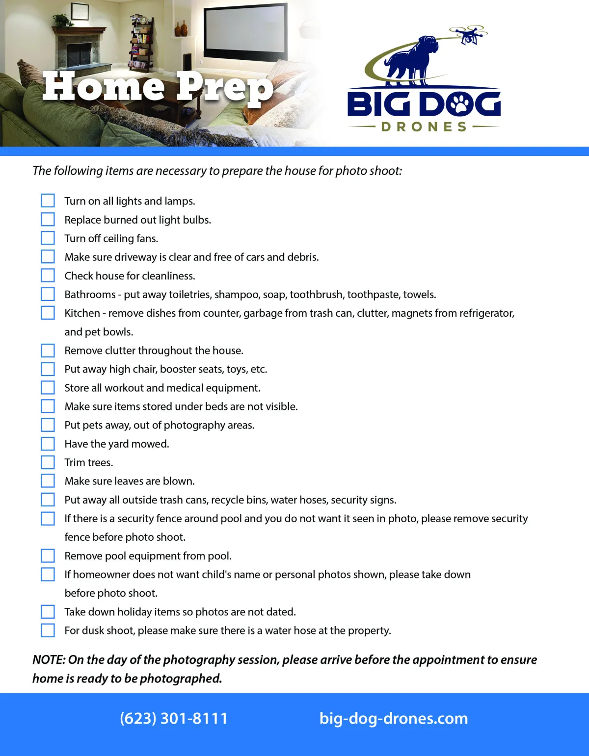 After setting an appointment with Big Dog Drones, please review the home preparation flyer to ensure your property is ready for the photo shoot. Here you will see all those requirements for photography